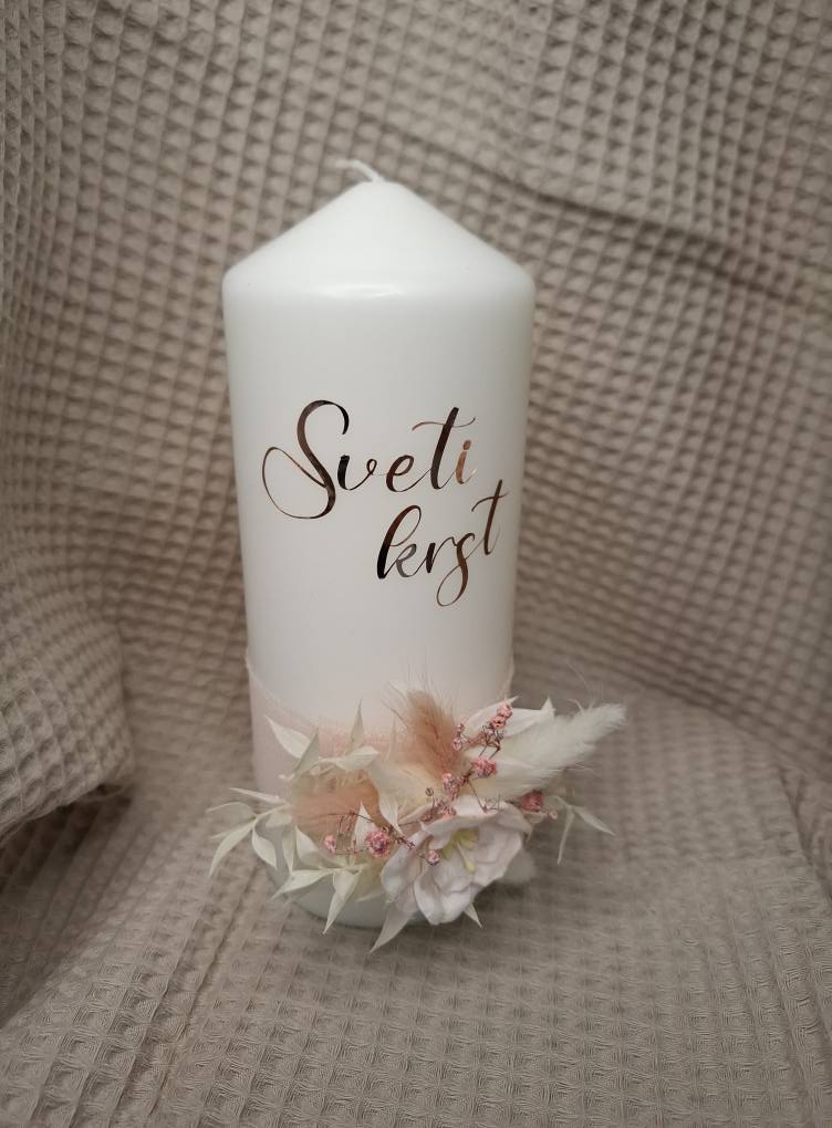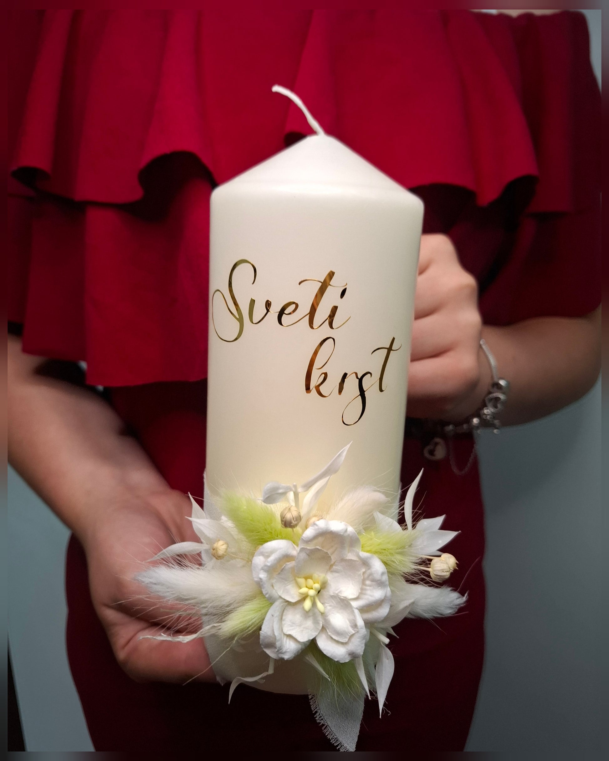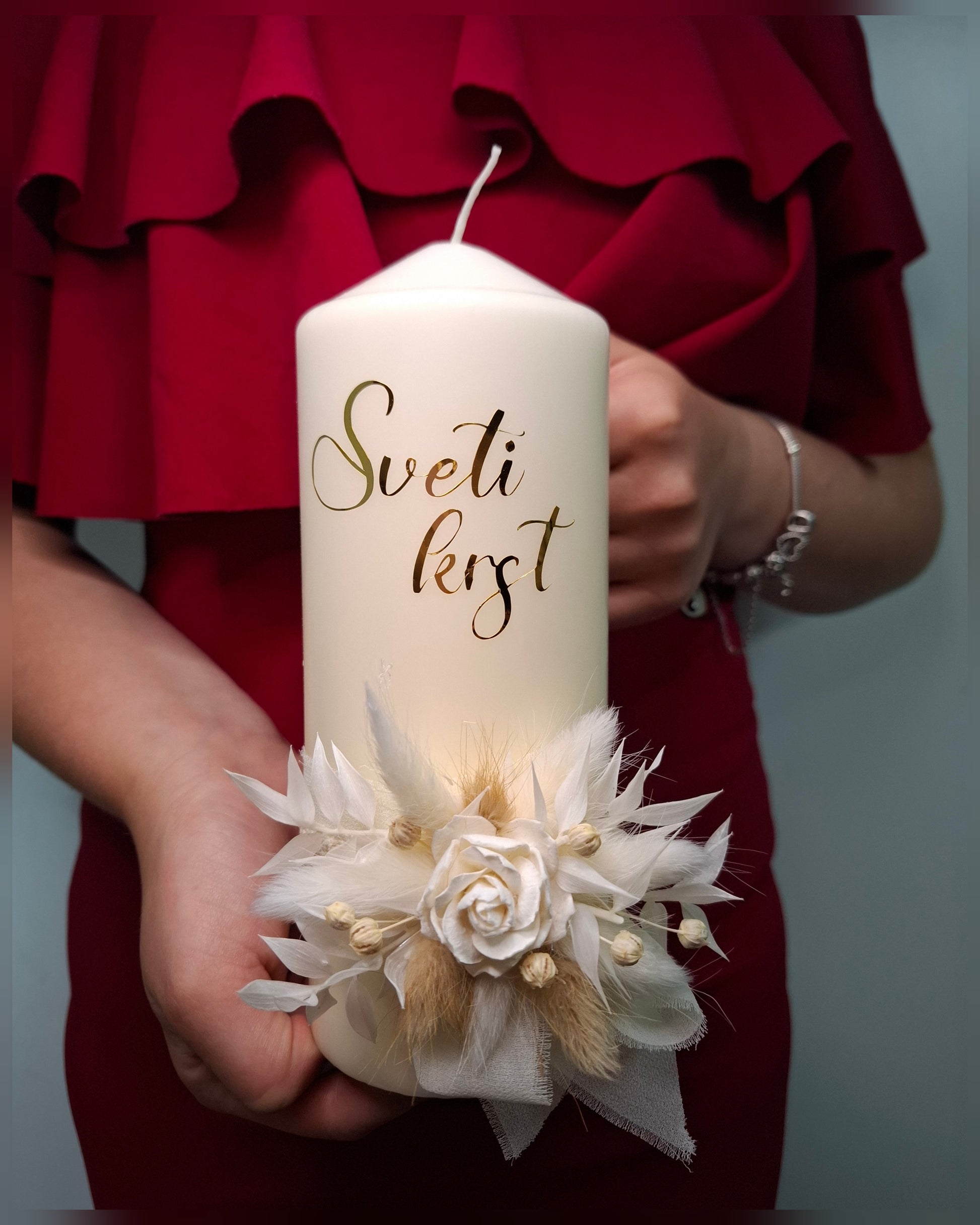 Elegantna krstna sveča, okrašena z naravnim suhim cvetjem in zlatim napisom Sveti krst.