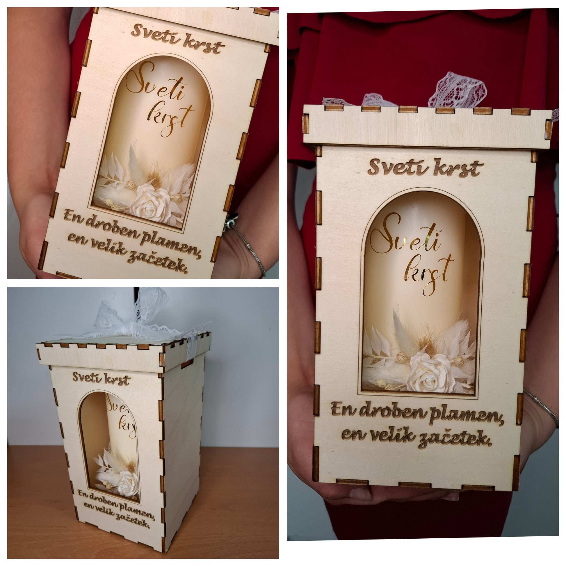 Sveča je varno shranjena v kakovostni leseni škatli, ki vsebuje osebno posvetilo. Celoten komplet je popolno darilo za krst ali lep spomin za družinsko ohranitev.