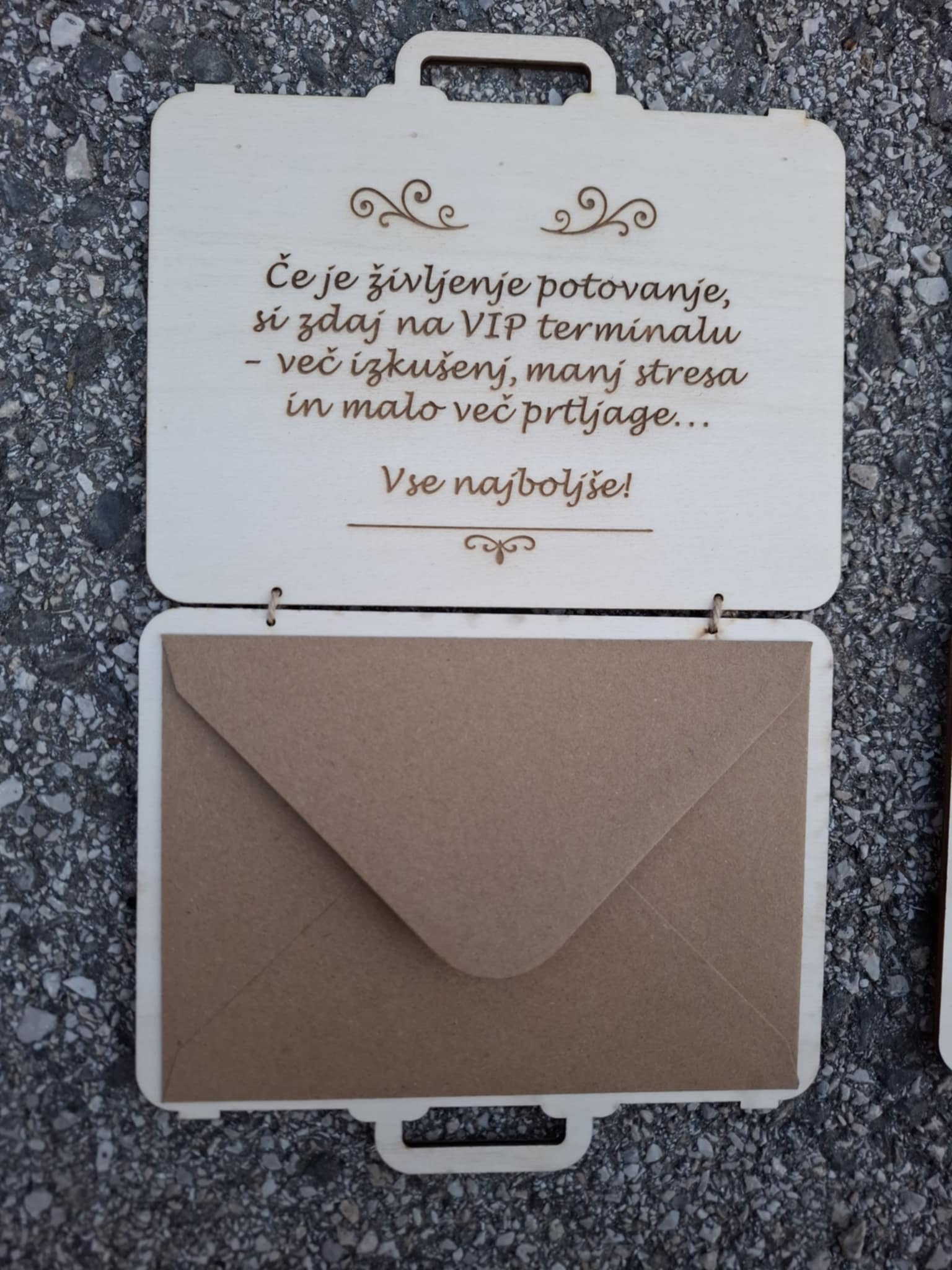 Lesena voščilnica v obliki kovčka – unikatno darilo za vsako priložnost!