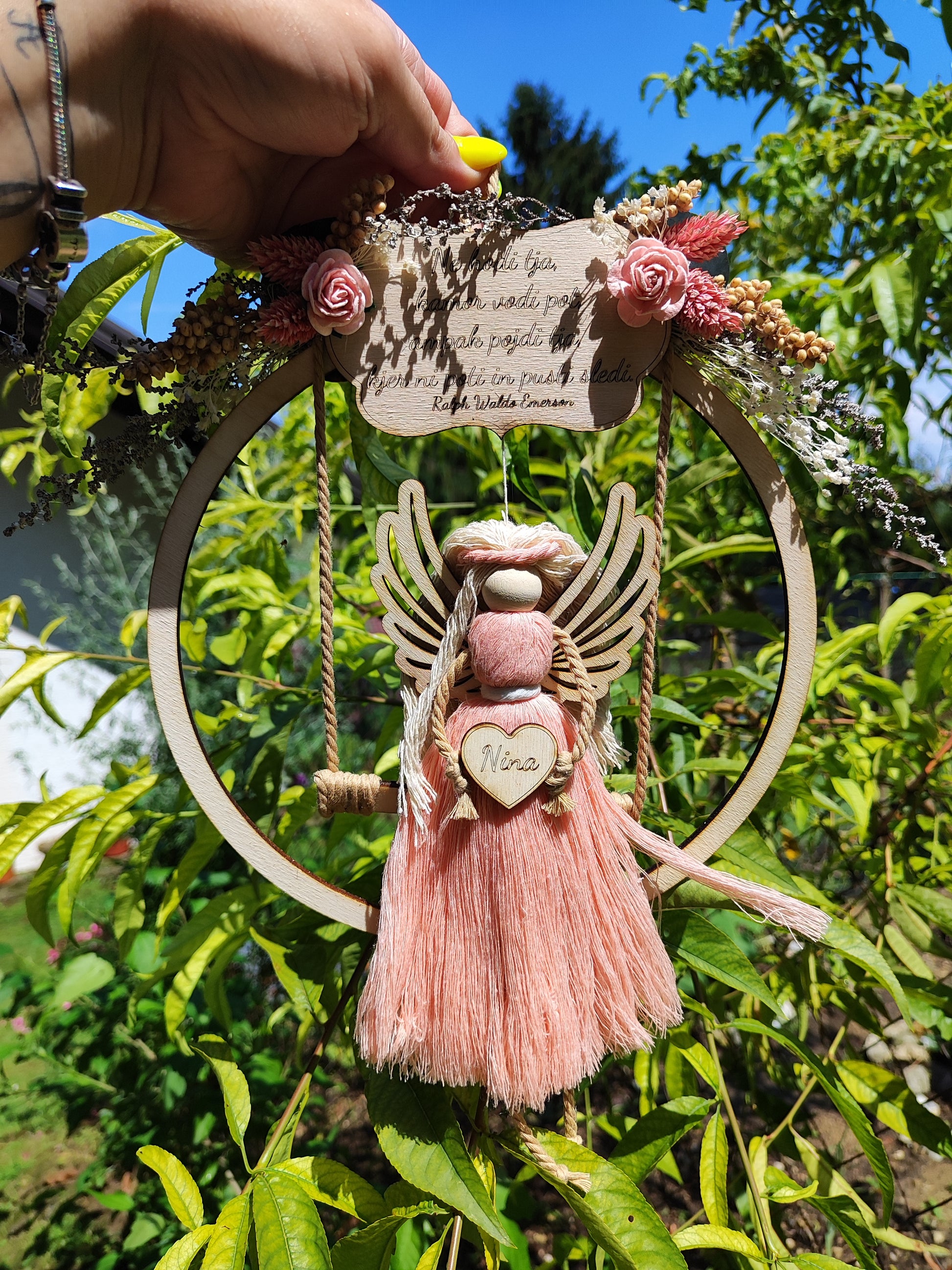 Nežen makrame angel, ročno izdelan na obroču, prinaša sporočilo miru, ljubezni in topline. Dodano posvetilo vašim željam naredi ta izdelek čudovit darilo za krst, obhajilo, birmo, poroko ali spomin na posebne trenutke.
