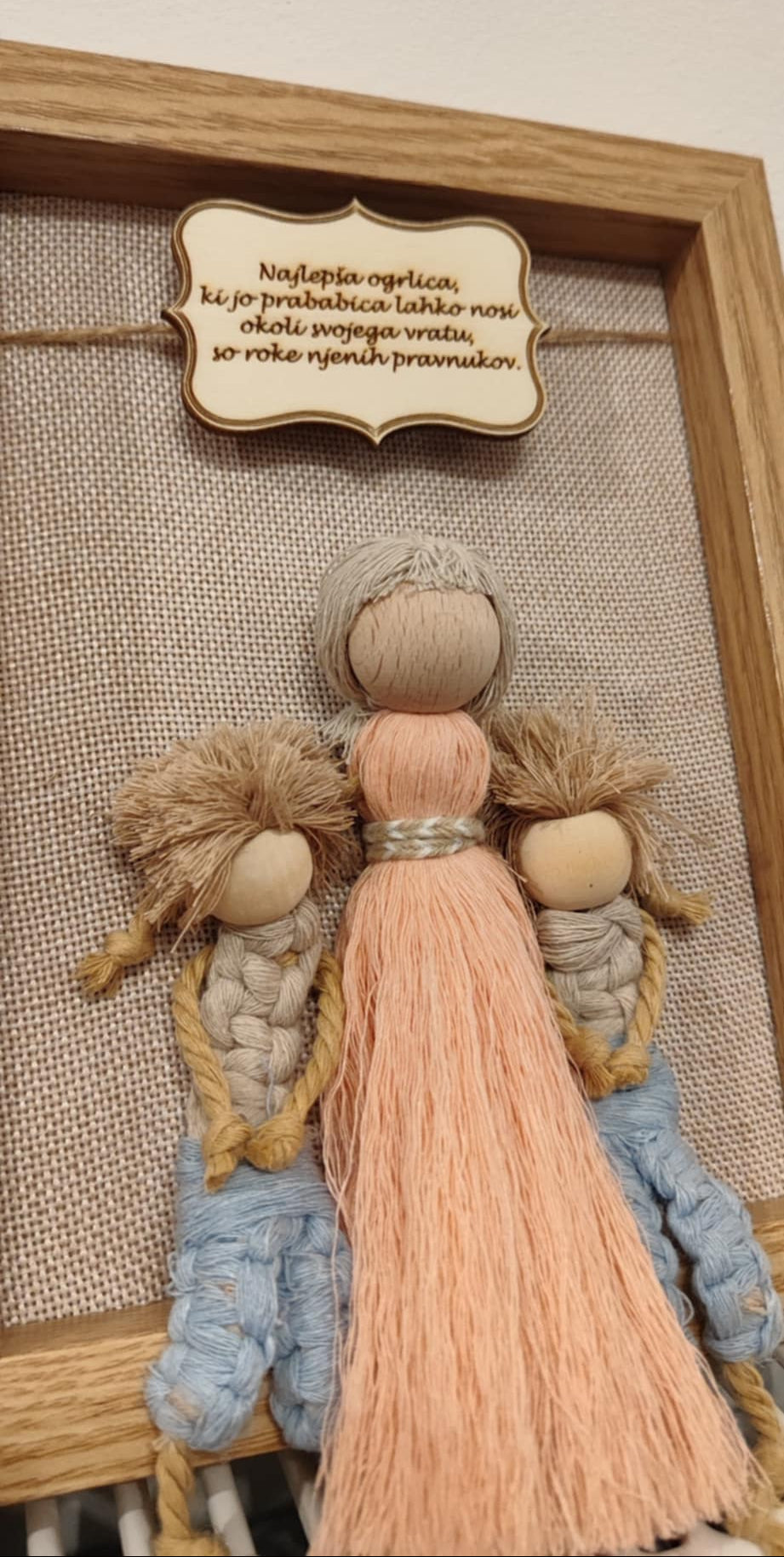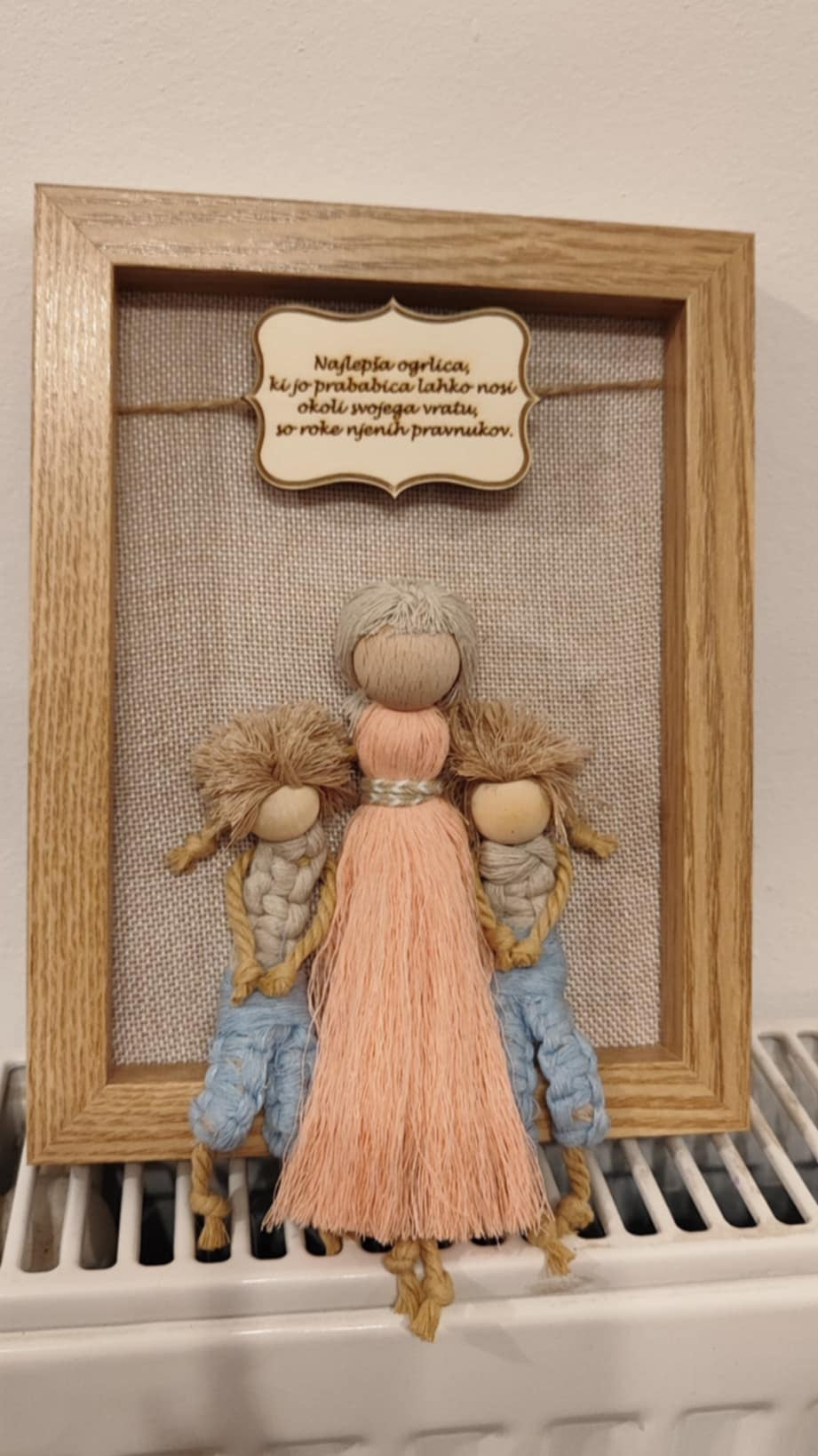Najlepše vezi so stkane med babico in vnuki – nežne, tople in polne ljubezni. Ta unikatna ročno izdelana dekoracija v okvirju prikazuje babico z vnuki (makrame), zraven pa je dodano ganljivo posvetilo, ki seže do srca.